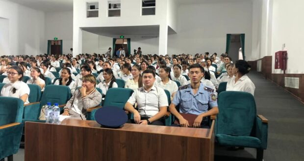 Кездесуде полиция қызметкеріне студенттер арасынан қызды алып қашқан адамға қандай жаза қолданатыны бойынша сұрақ қойылды. Полиция лейтенанты Абдухамит Абибуллаев жастардың қойған сауалдарына жауап беріп, құқықбұзушылық, ертежүктілік, аутодеструктивті мінез-құлықтың алдын-алу мәселелерінде айтып өтті. Отбасындағы зорлық-зомбылық деректерін анықтау мақсатында, сауалнамалар жүргізілді.