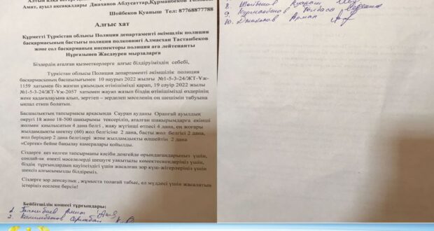 Бұл тұрғындар зейнеткер ұстаз Амит Тажибаев, ауыл ақсақалдары Төлбасы Құрманбеков, Абдусаттар Джаханов, «Алтын алқа» иегері Анжир Қожамбердиева. Аталған ауыл тұрғындары Түркістан облысы ПД Әкімшілік полиция басқармасының бастығы полиция полковнигі Алмасхан Тастанбеков пен осы басқарманың инспекторы полиция аға лейтенанты Жасдәурен Нұрғазиевке алғыстарын жаудырып, хат жолдады.