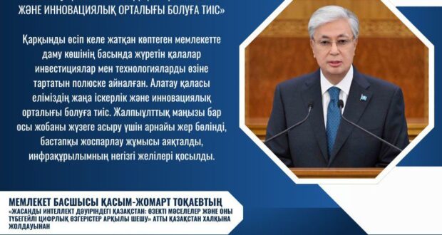 «Қарқынды өсіп келе жатқан көптеген мемлекетте даму көшінің басында жүретін қалалар инвестициялар мен технологияларды өзіне тартатын полюске айналған. Алатау қаласы еліміздің жаңа іскерлік және инновациялық орталығы болуға тиіс. Жалпыұлттық маңызы бар осы жобаны жүзеге асыру үшін арнайы жер бөлінді, бастапқы жоспарлау жұмысы аяқталды, инфрақұрылымның негізгі желілері қосылды.