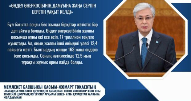 Бұл бағытта соңғы бес жылда бірқатар жетістік бар деп айтуға болады. Өңдеу өнеркәсібінің жалпы қосымша құны екі есе өсіп, 17 триллион теңгеге жуықтады. Ал, оның жалпы ішкі өнімдегі үлесі 12,4 пайызға жетті. Былтырдың өзінде 163 жаңа өндіріс іске қосылды. Соның нәтижесінде 12,5 мың тұрақты жұмыс орны пайда болды.