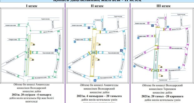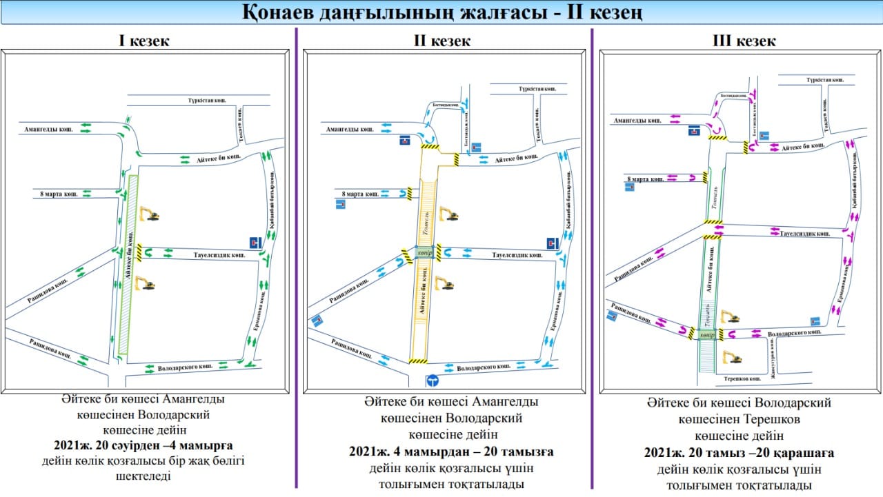 После завершения строительства подземного перехода по улице Тауелсиздик движение транспорта будет организовано по данной улице и с 20 августа по 20 ноября 2021 года для продолжения земляных работ будет перекрыто движение транспорта по улице Айтеке би от улицы Амангельды до улицы Гульбах.