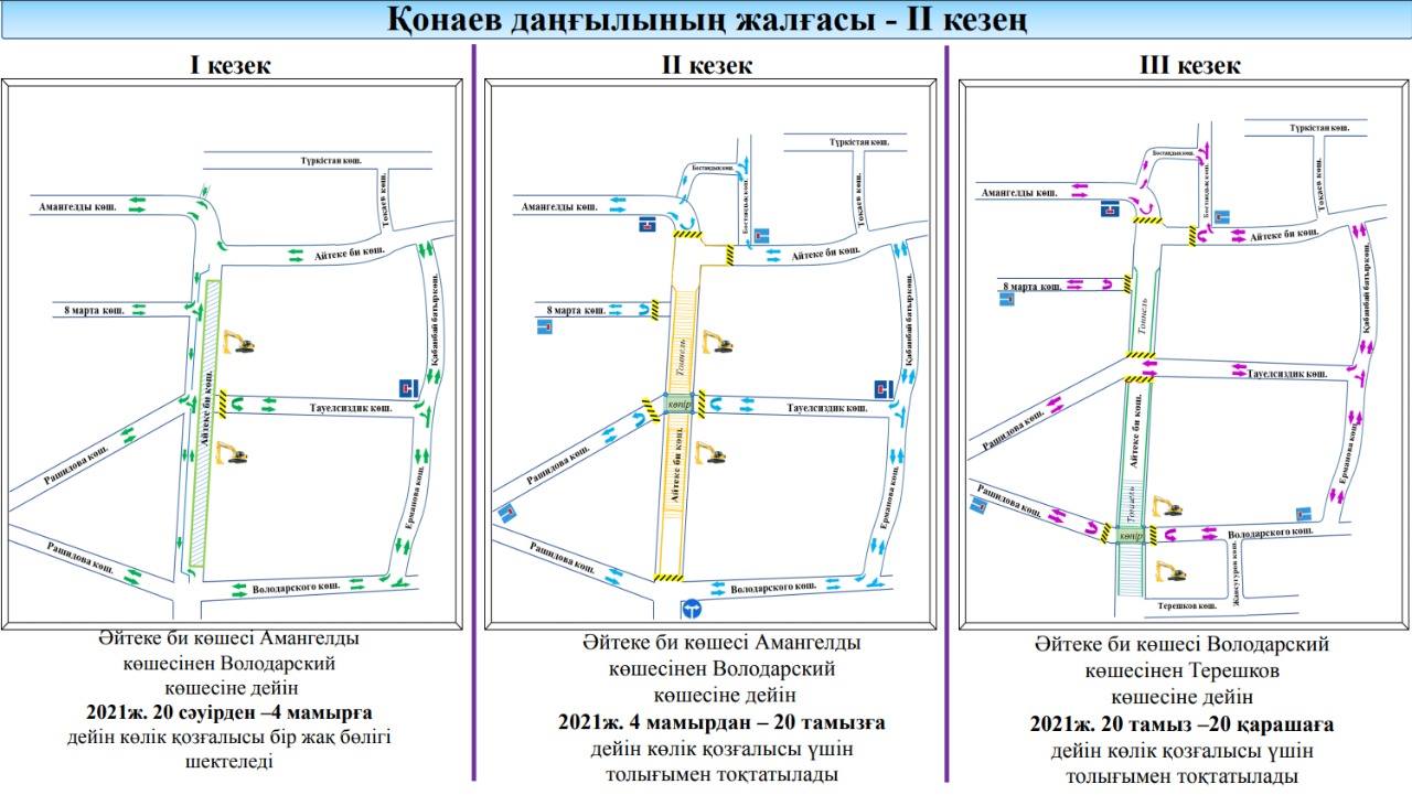 Жол құрылыстарының басталуына байланысты Қонаев даңғылы жалғасының II — кезеңі бойынша Әйтеке би көшесін Амангелді көшесінен Володарский көшесіне дейінгі аралықты 20 СӘУІР – 4 МАМЫР аралығында жабу жоспарлануда. Бір жақтама жол қозғалысы шектетіліп, асфальтобетон қабатын алу, жиектастарды бұзу, қазу жұмыстары жүргізілмек.